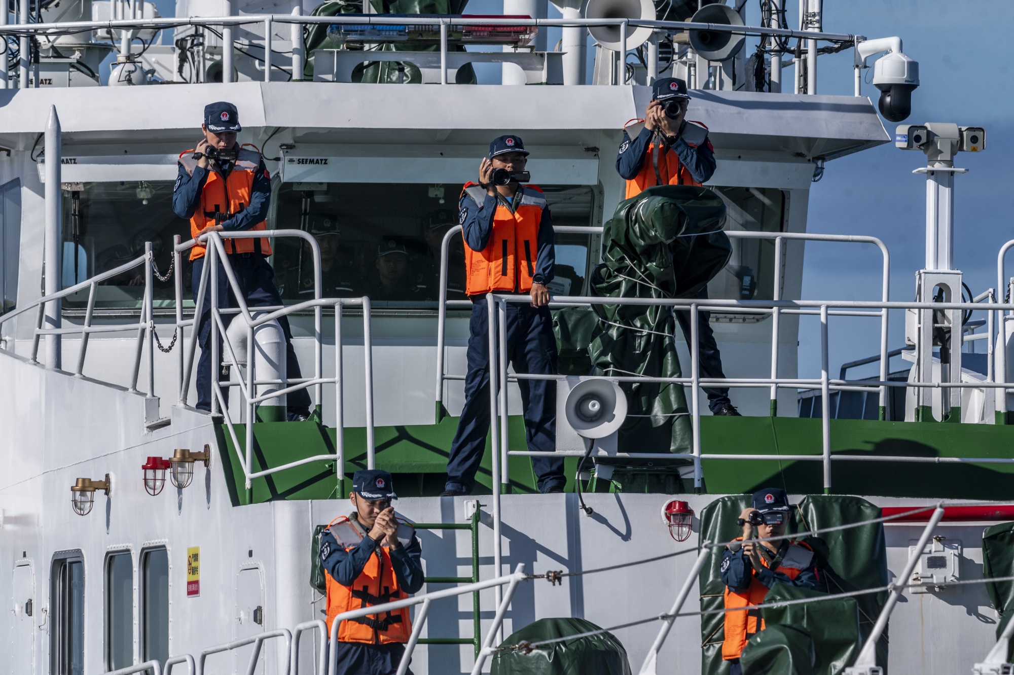 一艘中国海岸警卫船驶过一艘菲律宾海岸警卫队船只BRP Sindangan。摄影师:Lisa Marie David/Bloomberg“中国将继续采取必要措施,依法坚决维护我们的领土主权和海洋权益,”中国外交部发言人汪文斌在例行吹风会上表示。