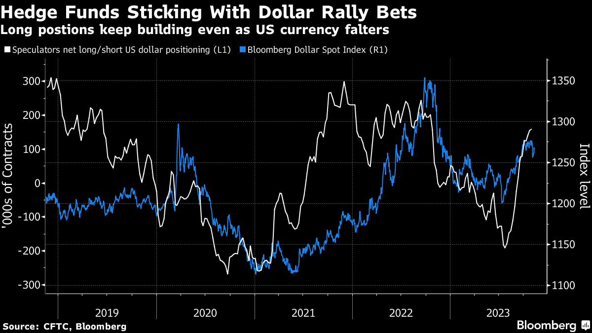 过去一个月,随着美联储向市场共识点头,暗示这一轮加息周期基本结束,美元失去了动力。与此同时,对冲基金和其他大型投机者继续增加对美元强势的押注。他们现在的看涨情绪与2022年底时一样强烈 —— 那时美联储决定放缓加息步伐导致美元暴跌。