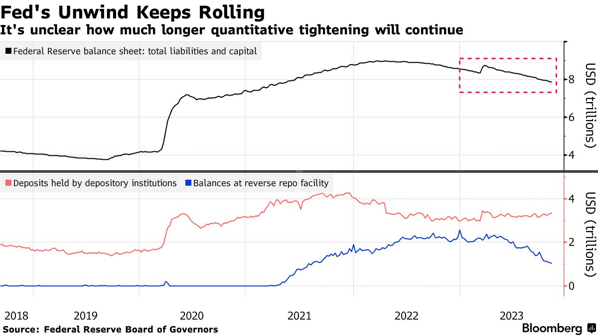 这个被称为量化紧缩的过程,自6月以来已经从美联储的逆回购设施中吸走了超过1万亿美元,那里是货币市场基金用来赚取额外现金利息的地方,留下了大约1万亿美元。尽管银行准备金仍然似乎处于丰富水平,但美联储并没有明确规定一个硬性的目标水平。