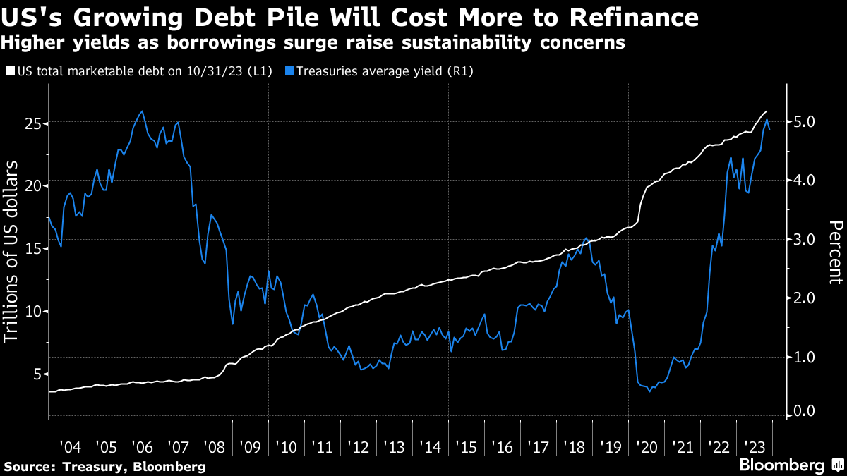 过去几年债务不断攀升,与此同时,由于飙升的通货膨胀和美联储的加息,收益率也大幅上涨。国会难以就政府支出的长期计划达成一致,债务发行看起来不太可能放缓。而美联储主席鲍威尔坚称现金利率将保持不变,直到决策者确信通胀得到控制,这将使收益率难以下降。不断攀升的利息账单增加了困难,增加了国债收益率和波动性进一步上升的可能性。这还没有考虑政府持续存在的功能障碍,这威胁着又一次联邦政府关门。加菲尔德·雷诺兹是总部位于悉尼的亚洲彭博新闻社首席利率记者。