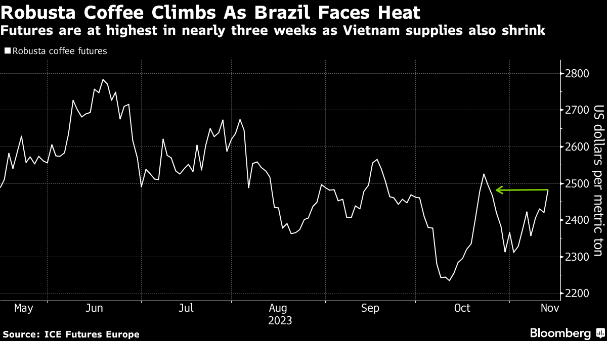 伦敦的罗布斯塔咖啡期货价格因巴西的极端高温和越南的干旱而大幅上涨。