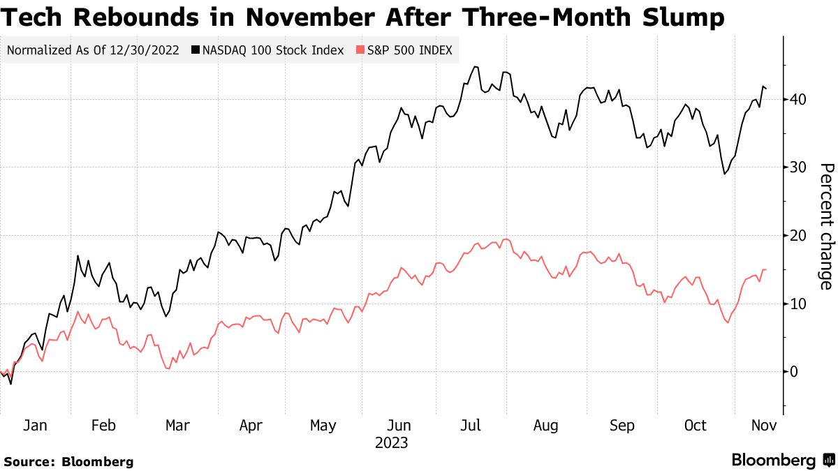 人工智能和云计算的炒作也推动投资者抢购那些在这一增长趋势中将成为赢家的公司的股票。纳斯达克100指数在2023年上涨超过41%,超过标普500指数近15%的涨幅。