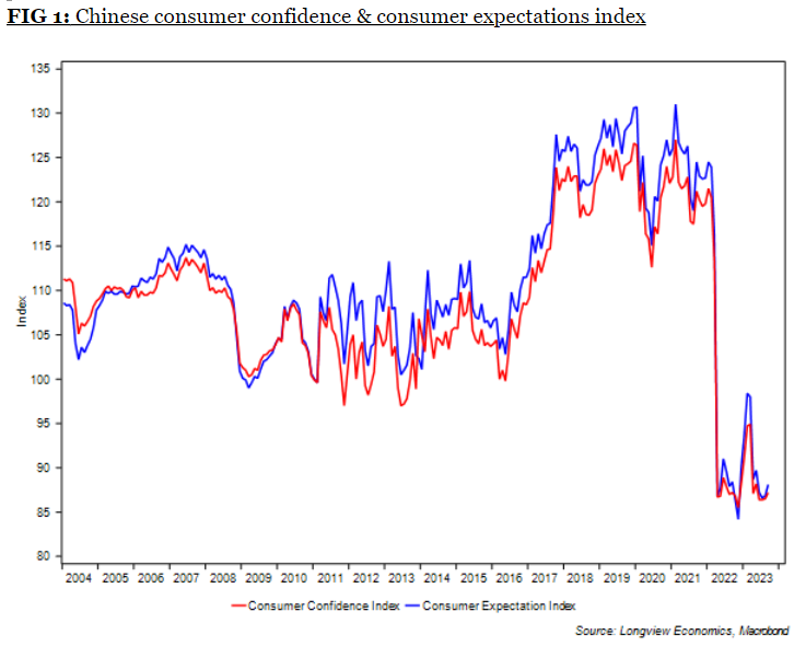 然后还有习近平。这位中国领导人最近加倍致力于促进经济增长和稳定市场,甚至首次访问中国人民银行,以展示他在工作中的努力。当局和全球投资者急切期待的新冠疫情重启繁荣并未如愿。与拜登一样,习近平必须应对一个对经济感到糟糕并且不乐观的人口,正如彭博观点的任舒丽在这里写道。这是疫情带来的戏剧性变化,自那时起就没有恢复。下面的图表来自伦敦Longview Economics的克里斯·沃特林: