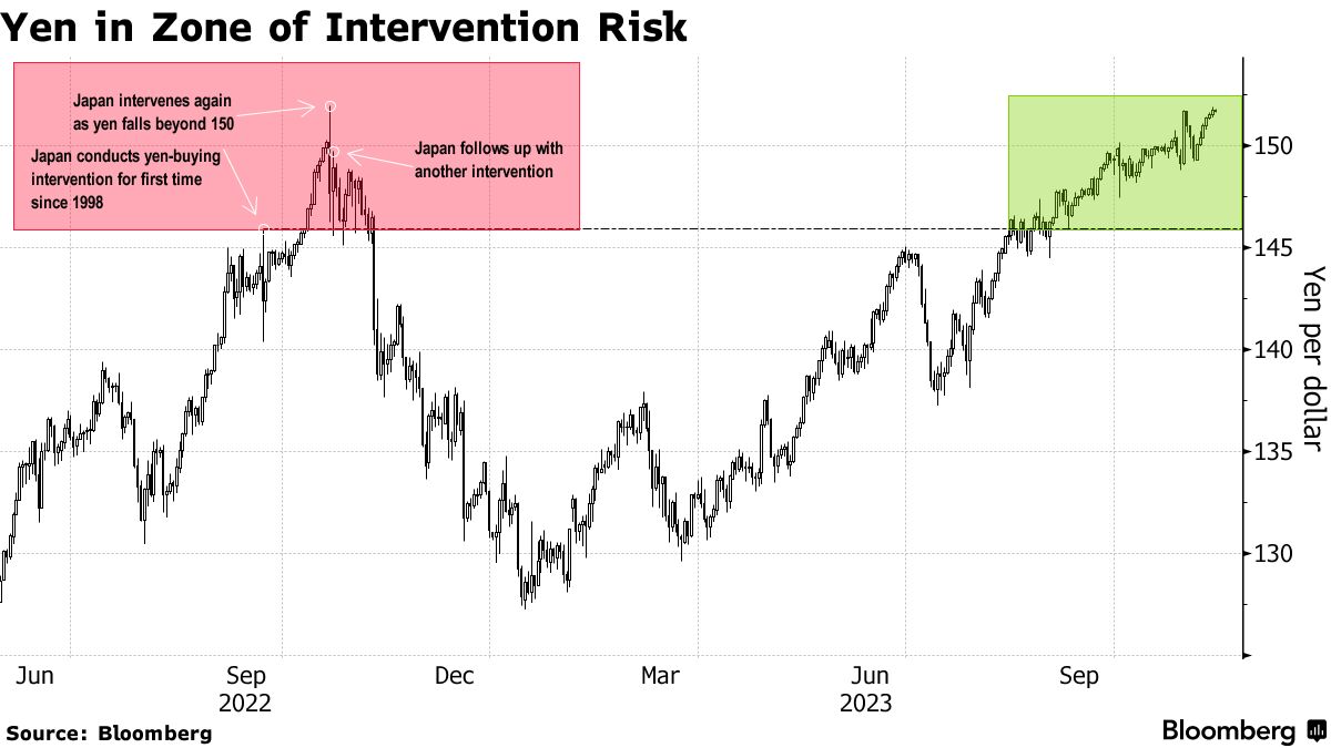 日元已经交易到去年干预的水平,周一几乎触及对美元的关键151.95阈值。日本财务大臣铃木俊一本周多次警告,政府将对过度波动做出回应。