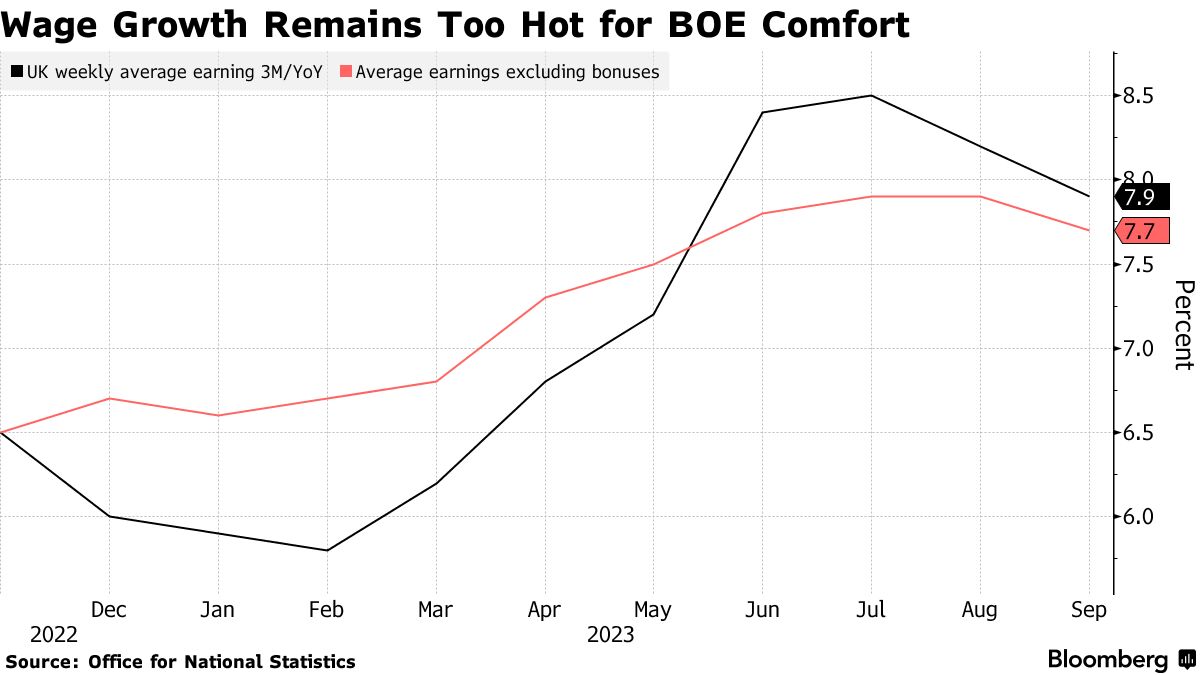 “最新一批就业数据显示,英国央行将继续坚持其“更高更久”的政策。劳动力市场和工资增长有所降温,但不足以让央行确信能够迅速将通胀率提高到2%。”