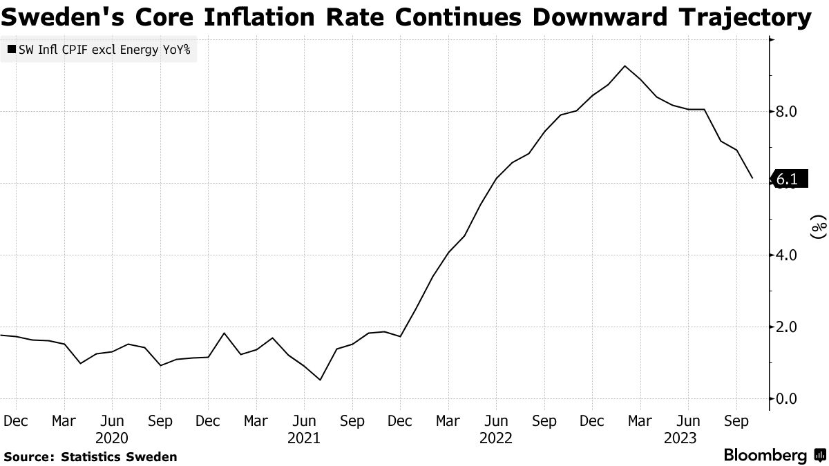 瑞典统计局周二发布的数据显示,不包括能源和利率变化的价格较去年同期上涨了6.1%。这低于彭博调查中经济学家预期的6.3%,而瑞典央行在最近一次会议上预计为6.0%。