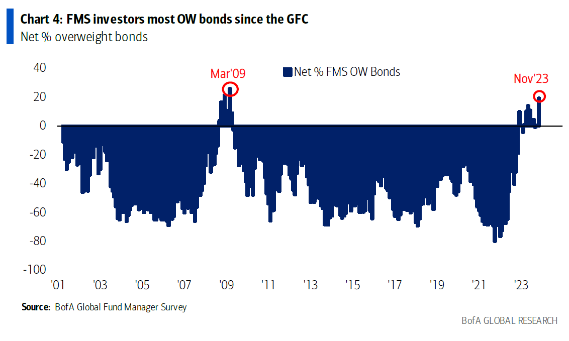 这一月度调查显示,投资者正在抛售现金,持有自2009年以来最大的债券超配头寸。美银的Michael Hartnett表示,“重大变化”不在于宏观前景,而在于预期通胀和收益率将在2024年下降。