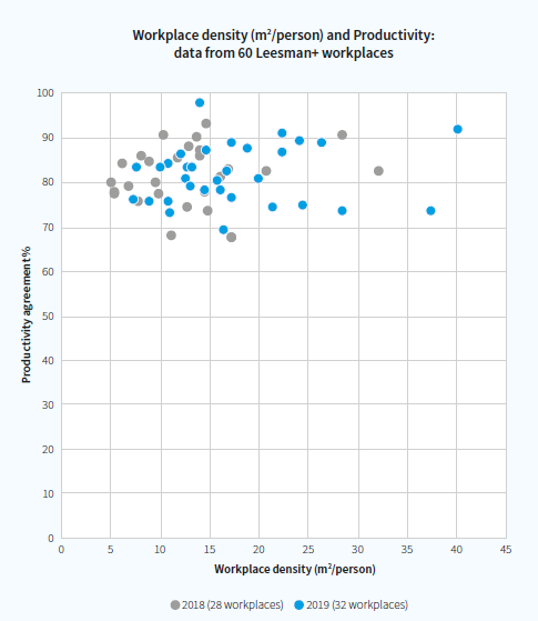 Leesman调查员工的工作场所体验和生产力,制定出高分雇主可以吹嘘。2019年,Rothe比较了Leesman的生产力得分与每位工作者的空间,希望这可能指向一些最佳的平方米数量。然而,她发现几乎没有任何相关性。