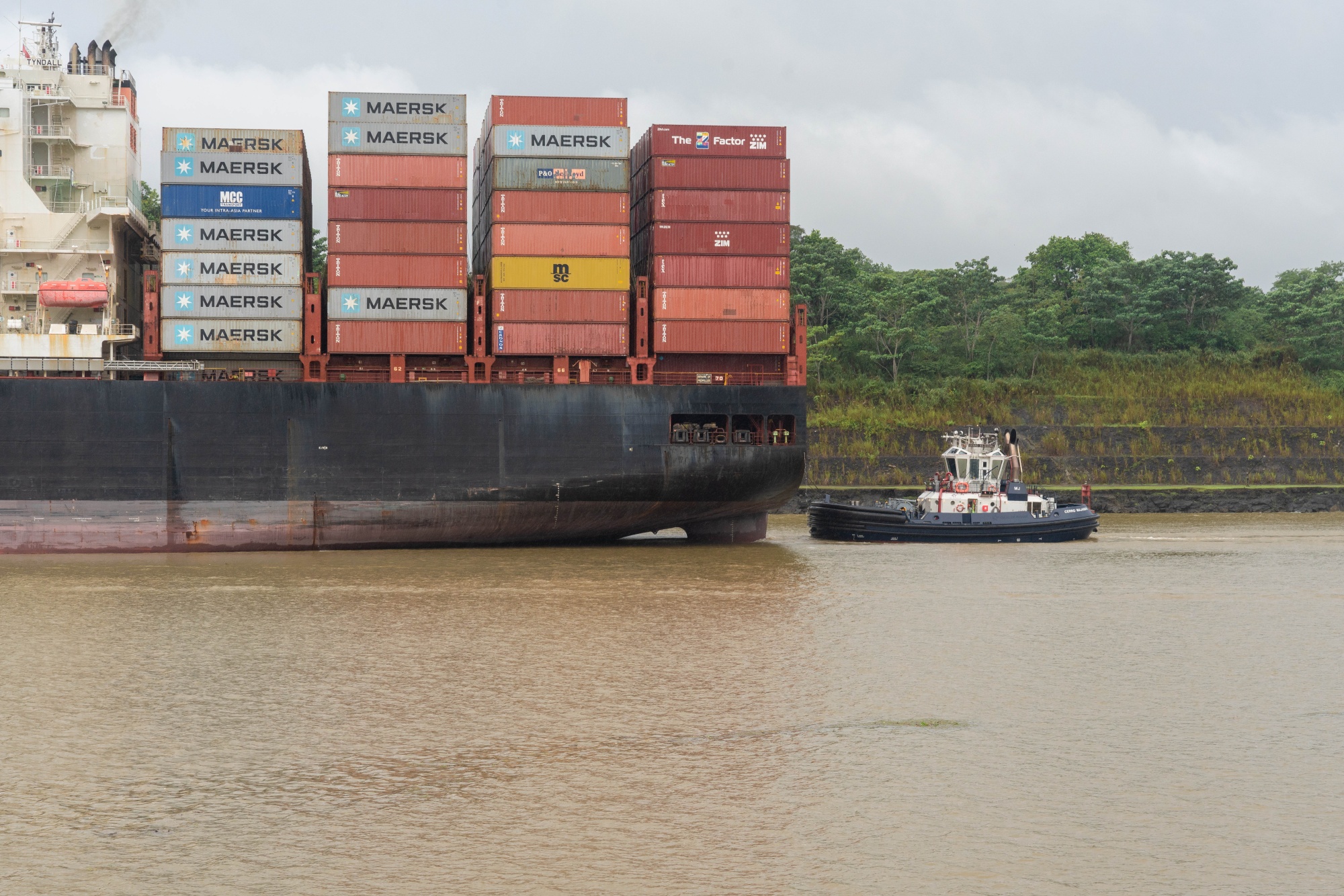 一艘拖船引导一艘集装箱船于2023年11月2日驶入巴拿马运河。