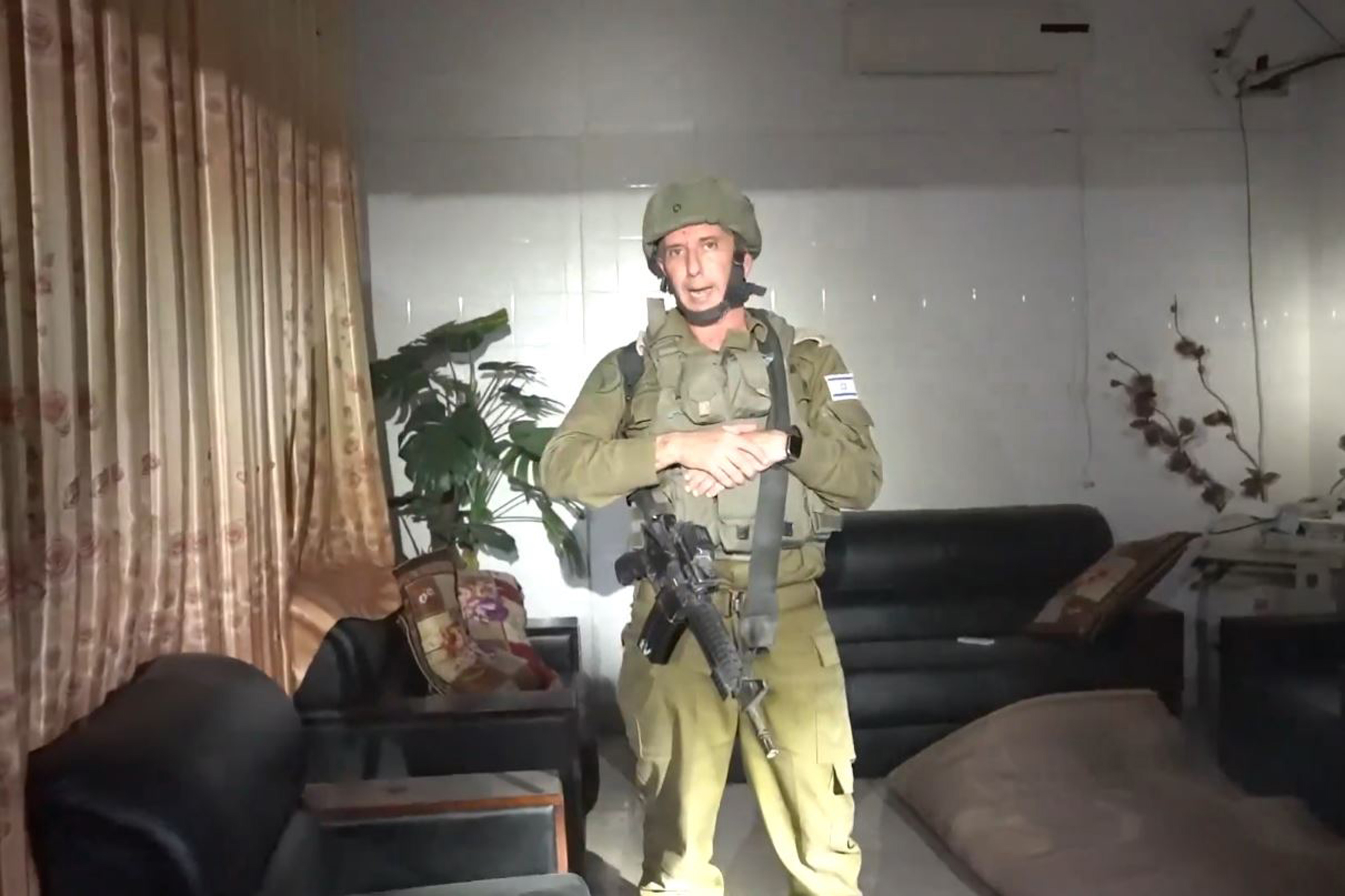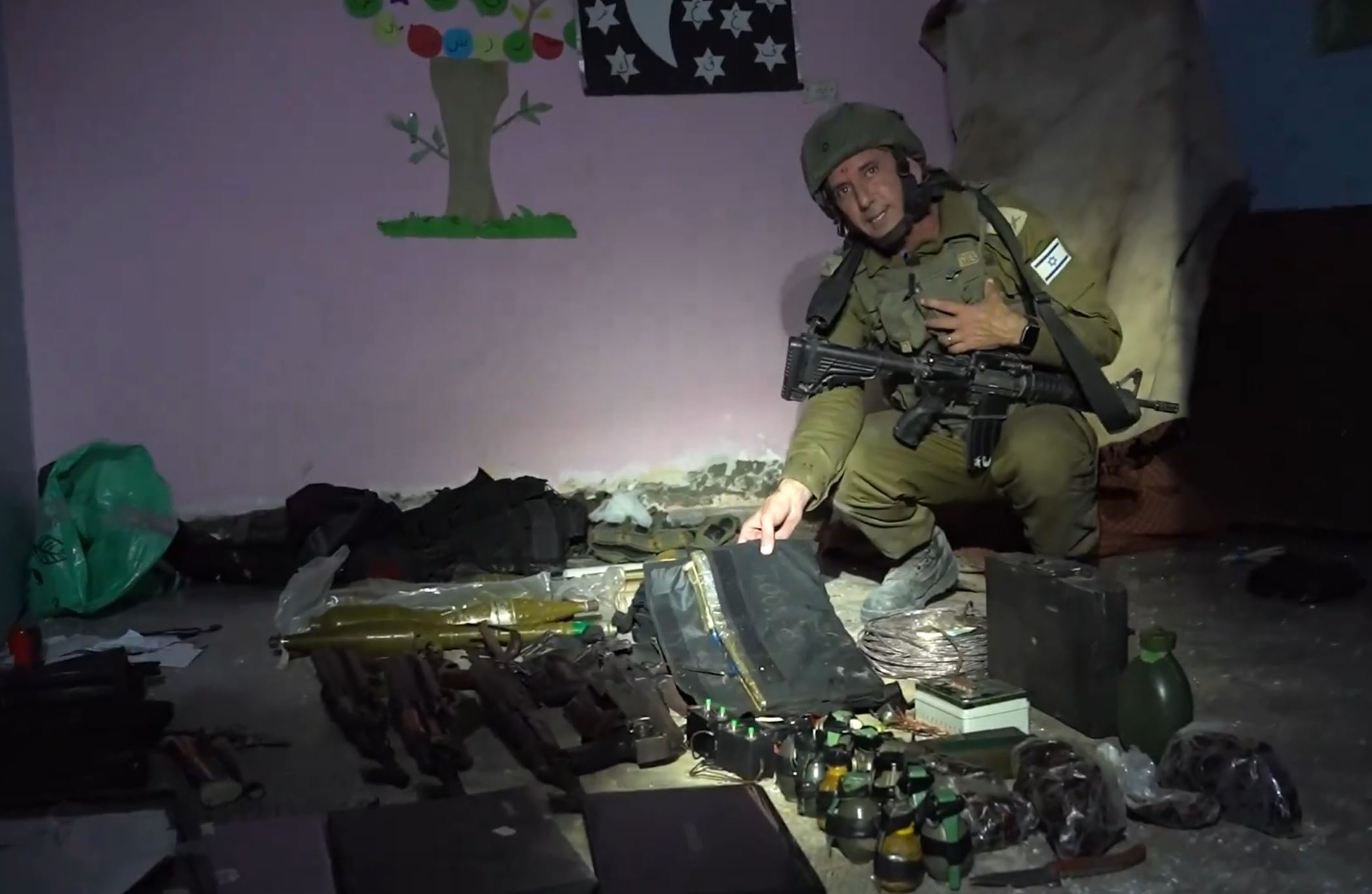 以色列国防军提供的视频截图显示,发言人丹尼尔·哈加里在加沙市兰提西医院附近的隧道中发现的武器。来源:以色列国防军哈加里说,200米外的一座被俘虏的房子以前是哈马斯海军行动负责人的住所,之间修建了一条隧道。