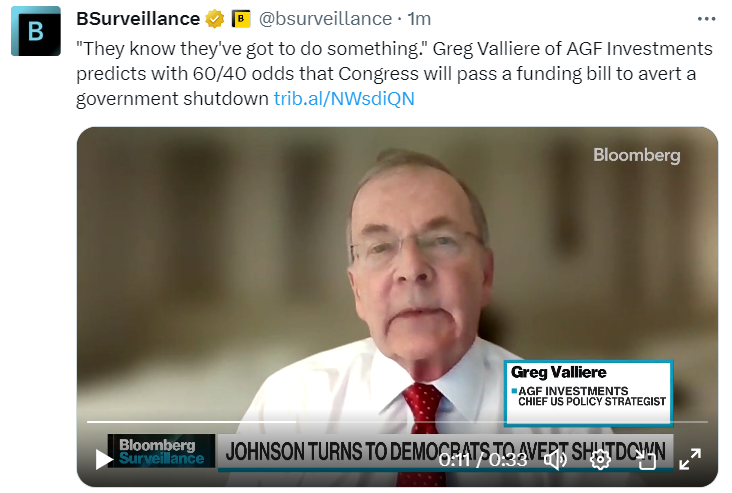 AGF投资公司的格雷格·瓦利尔认为,避免政府关门的预算协议通过的几率为60-40,有利于众议院通过新议长迈克·约翰逊推动的协议,尽管一些不满的共和党人在抱怨。目标是在当前短期资金法案到期后保持政府的运转。