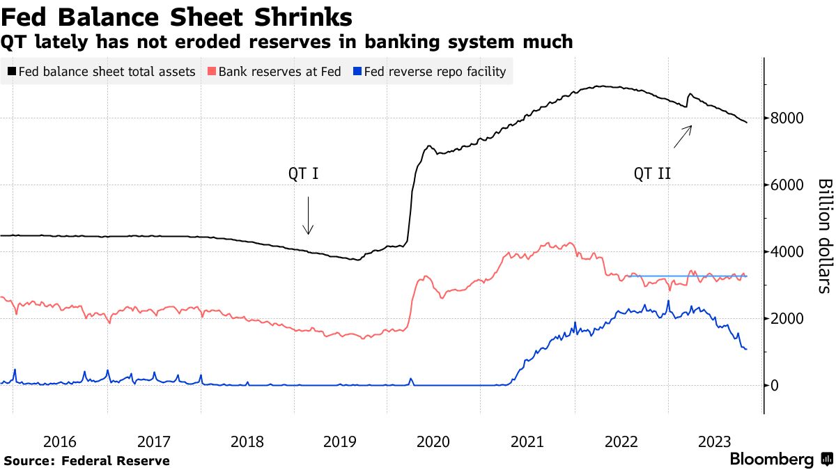 尽管这是QT的一个影响,但最近并没有发生太多。这是因为美联储通过QE向系统注入的资金随着时间流动,其中很多资金流入了美联储的一个名为反向回购协议(RRP)的东西。因为这往往被货币市场基金使用,所以它与经济中的信贷流动没有那么直接的联系,就像商业银行储备那样。到目前为止,QT主要导致RRP缩减,而不是储备。但这将会改变,一旦RRP被耗尽,储备将下降。