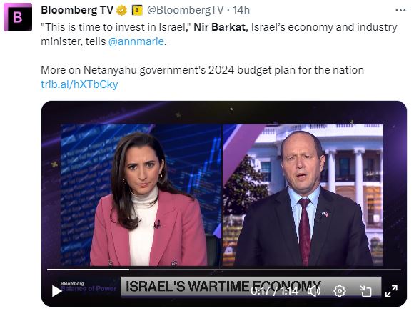 今天在彭博电视台的权力平衡 节目中,主持人乔·马修和凯利·莱因兹将就保持政府开放的新协议以及对以色列和乌克兰援助的未来进行采访。在昨天的节目中,以色列经济和工业部长尼尔·巴卡特讨论了以色列经济的前景。