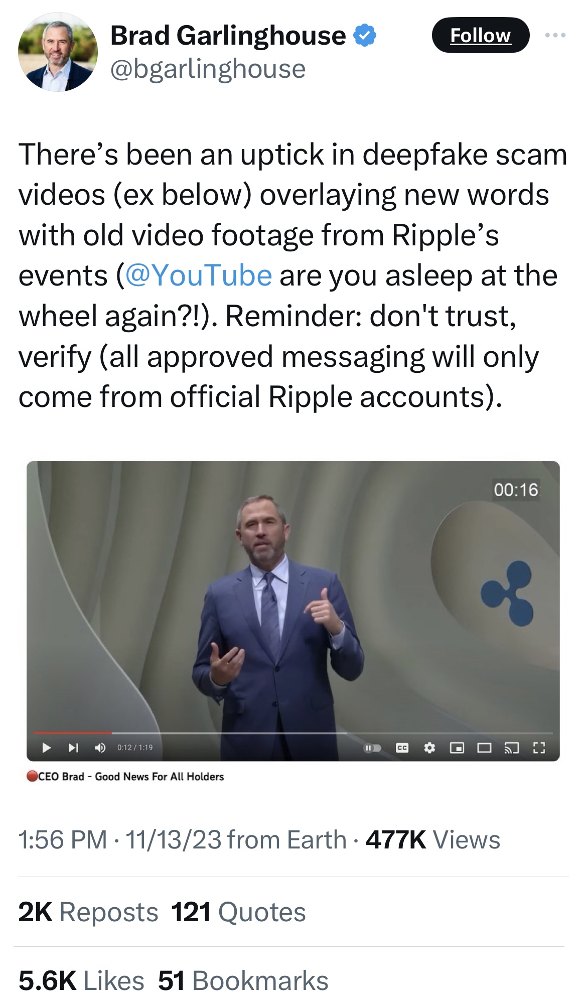 一份声称来自黑石集团的XRP备案文件竟然出现在官方特拉华州网站上,注册了在该州设立的投资信托。 (特拉华州官员将此事转交给了州司法部。)巧合的是,这发生在瑞波首席执行官布拉德·加林豪斯在X社交媒体平台上警告追随者要警惕“深度伪造诈骗视频”,并且不要相信而是“核实”有关瑞波的新闻之后。