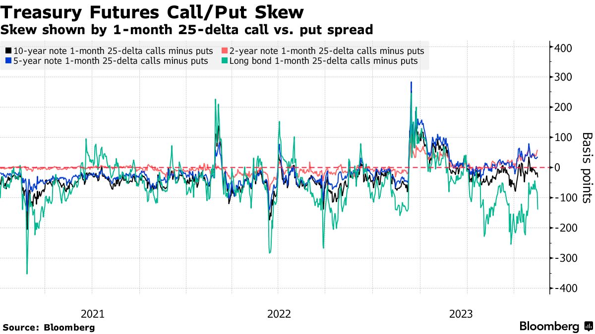 用于对冲美国国债收益率曲线长端抛售的保费偏离了用于对冲短端和中端升息的保费,这一点可以通过长期债券期货与2年期和5年期合同的期权偏离来显示。自上周开始以来,美国30年期国债收益率的范围为4.59%至4.835%。