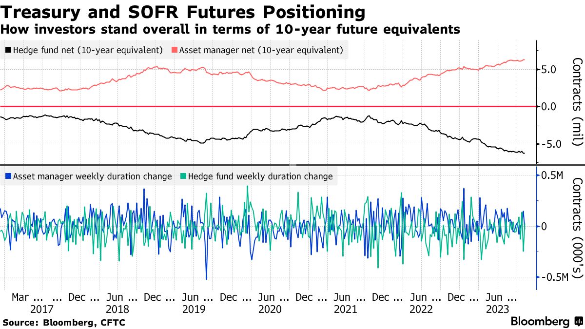 在期货市场上,对冲基金在截至11月7日的一周内增加了2年期和5年期合约的净空头头寸,这表明平仓交易对周二的涨势起到了推动作用。美国银行公司的模型显示,商品交易顾问“继续在曲线后端平仓,我们的模型表明,如果动量指向更长期,可能还会有更多的平仓行为”,包括梅根·斯威伯和安娜(才艺)张在11月13日的一份报告中写道。