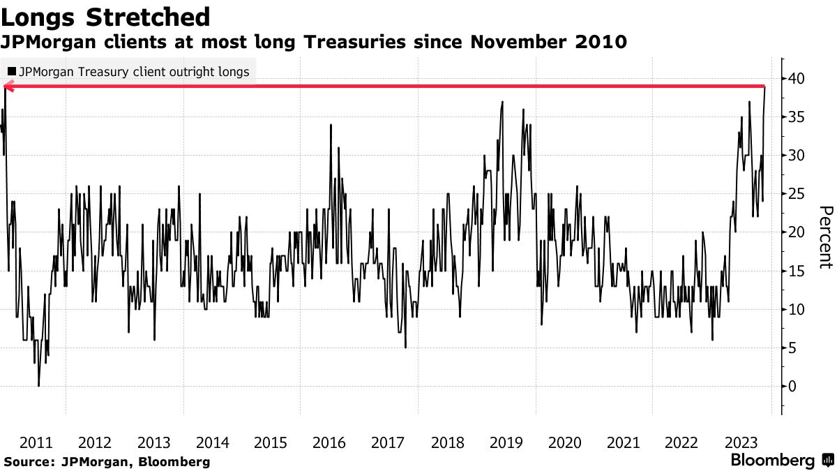 根据截至周一的数据,摩根大通对国债客户的最新调查显示,多头头寸激增至2010年11月以来的最高水平,从中性持仓转变。这一时机恰逢周二公布十月通胀报告后债券市场的激增。调查显示,净多头头寸是自六月以来最高。