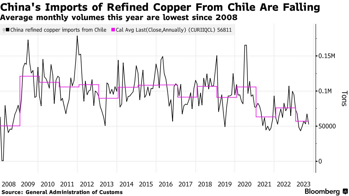 中国从智利进口的精炼铜总量 — 智利国家铜公司主导生产 — 据中国海关数据显示,今年有望达到自2008年以来的最低年度量。中国购买更多的铜精矿,而不是金属。