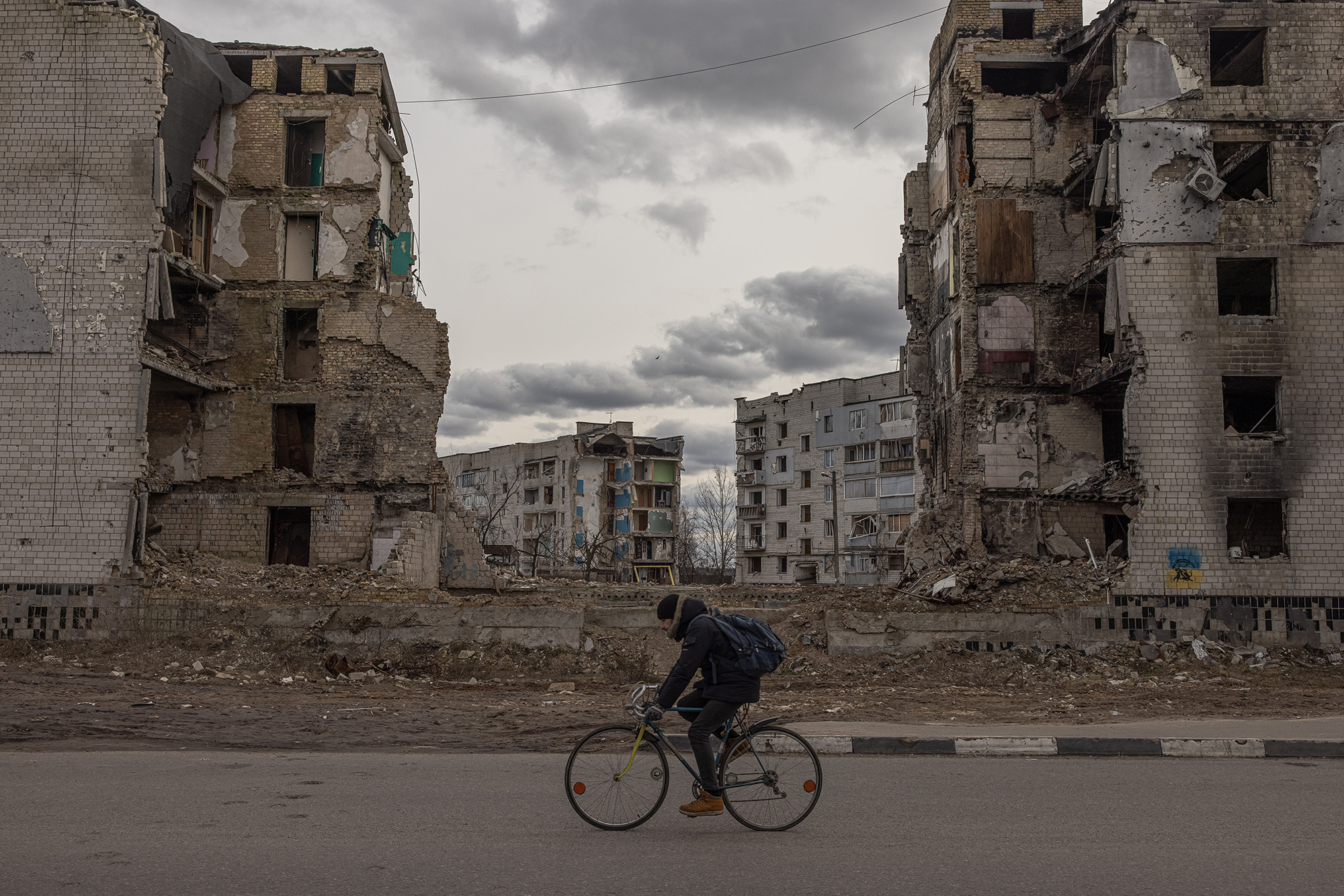 一名男子骑着自行车经过在乌克兰博罗迪安卡被俄罗斯袭击摧毁的住宅楼。