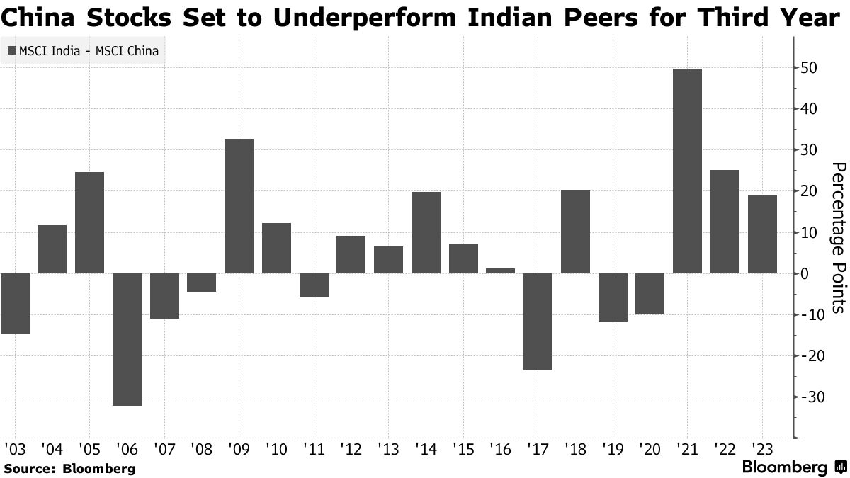 MSCI中国指数迄今已经下跌约9%,为其第三年亏损,受到该国经济增长放缓和地缘政治风险的拖累。另一方面,MSCI印度指数则有望连续第五年实现年度收益,受到企业业绩稳健的支撑。