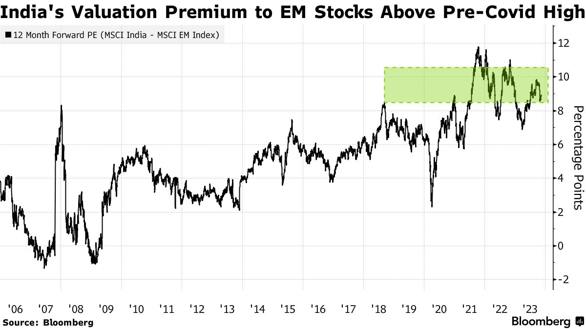 在2021年8月的一次采访中,这位策略师表示,由于北京的监管打击,投资者撤出中国将忽视印度,因为那里的股票看起来价格昂贵。2022年,印度在全球利率收紧的情况下看到创纪录的资金外流,尽管基准继续攀升。
