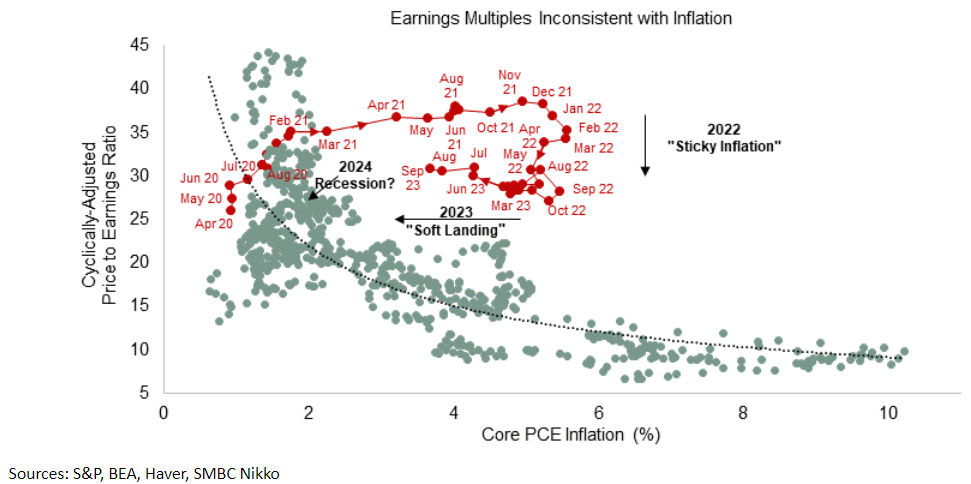 接下来是一个相关的问题——如果通胀正在放缓,这对股票的倍数有什么影响?历史表明它们需要下降,这将是购买债券的另一个理由。SMBC日航的美国高级经济学家特洛伊·卢德特卡(Troy Ludtka)的这张图表显示了标准普尔500指数的周期调整价格/收益倍数与核心个人消费支出通胀水平之间的关系,这是美联储最喜欢的衡量标准。随着时间的推移,存在一种关系,即更高的通胀率导致较低的倍数(以弥补通胀对股票回报的侵蚀方式)。基于这一点,2021年的涨势显示为一个巨大的异常值。2021年末,标普500仍然处于顶峰,看起来像是疯狂的。此后,随着通胀在2022年上升,倍数下降,今年它们已朝着历史趋势发展。它们依靠通胀下降来实现这一点: