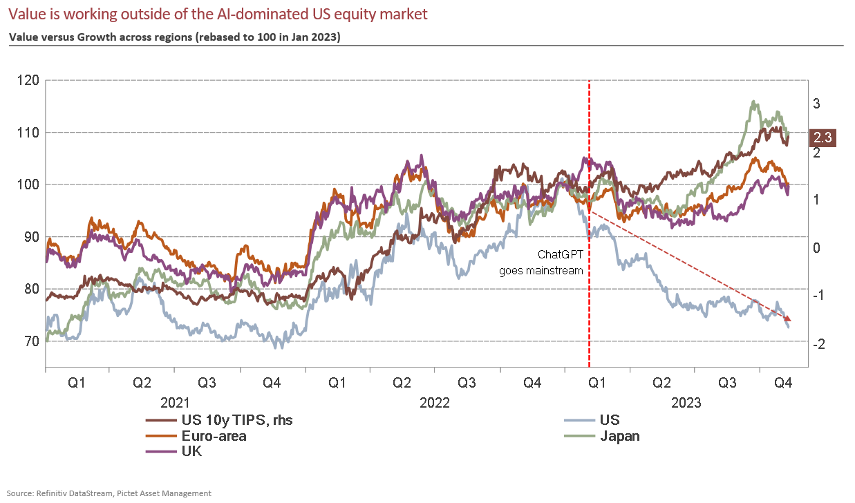 由于人工智能和大科技引起的兴奋情绪,这种分歧似乎并未在美国以外得到分享,这在瑞士百达资产管理的图表中清晰地得到了体现。除了日常波动外,在过去两个季度中,价值股在各地区击败了成长股,这在债券收益率上升的环境中是典型的趋势。价值股的上涨大致与全球范围内的美国实际收益率保持一致。只有美国在逆市中脱颖而出: