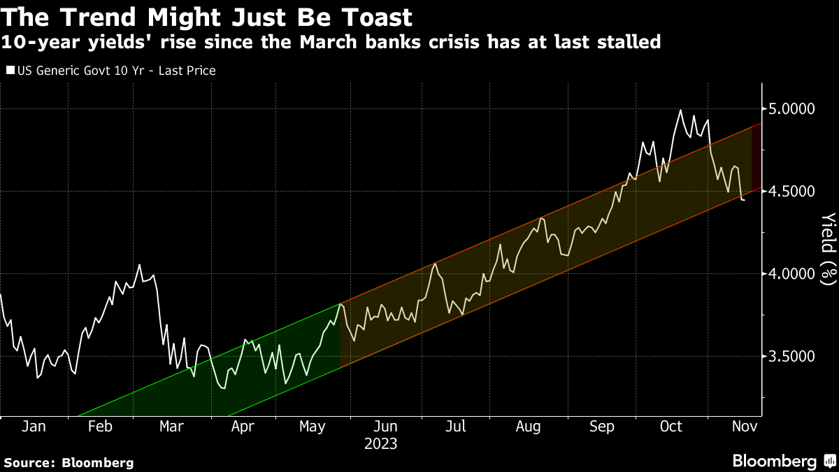 有这么多人倾向于购买债券,因此当有关缓解通胀的好消息出现时,引发剧烈反应并不奇怪。自市场从三月银行倒闭的冲击中恢复以来,10年期收益率的稳定上升趋势似乎终于结束了。(我在终端上画了这些趋势线,毫无疑问还有其他观察方式——但很难否认收益率长期以来一直呈明显上升趋势,而现在似乎已经结束):