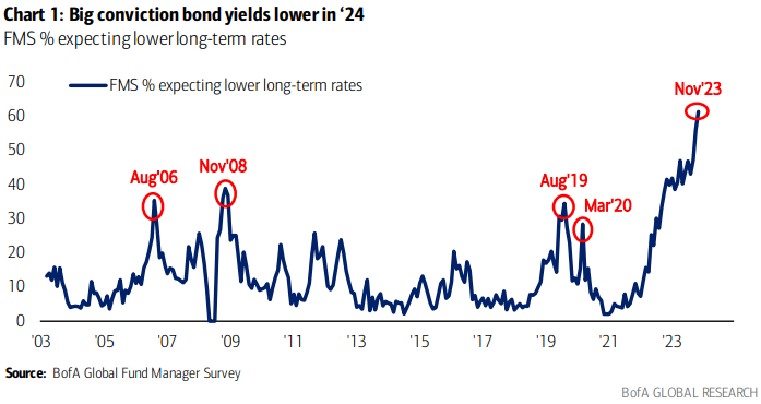 在看看债券市场对这一消息的强烈反应之前,重要的是要了解许多投资者只是在等待一个好的购买机会。美国银行最新进行的基金经理调查在通胀数据发布几小时前公布。调查显示,有史以来最大的信心认为长期收益率正在下降: