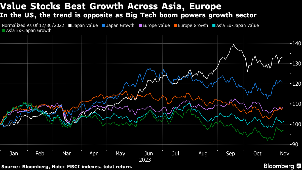 这就是其他地方的投资者实质上在打赌的内容。正如跨资产团队的同事所记录的那样,看起来便宜的股票在日本的MSCI指数中表现优异,即使有人预期日本央行可能会在年底前取消负利率。在各个地区,价值领先: