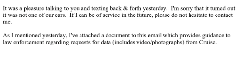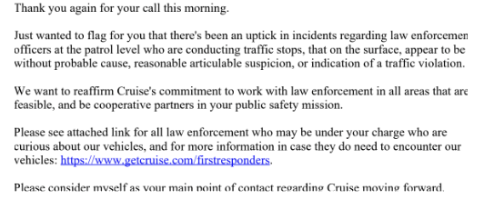在其他情况下,警方和总部位于旧金山的Cruise(由 通用汽车公司拥有)合作。在6月份的一次会议后,Cruise写信感谢警方的“坦率和建议”,并邀请旧金山警察局的警官们参观他们的公司办公室。与此同时,警方后来要求该公司分享车辆摄像头的录像以帮助解决一起犯罪案件。