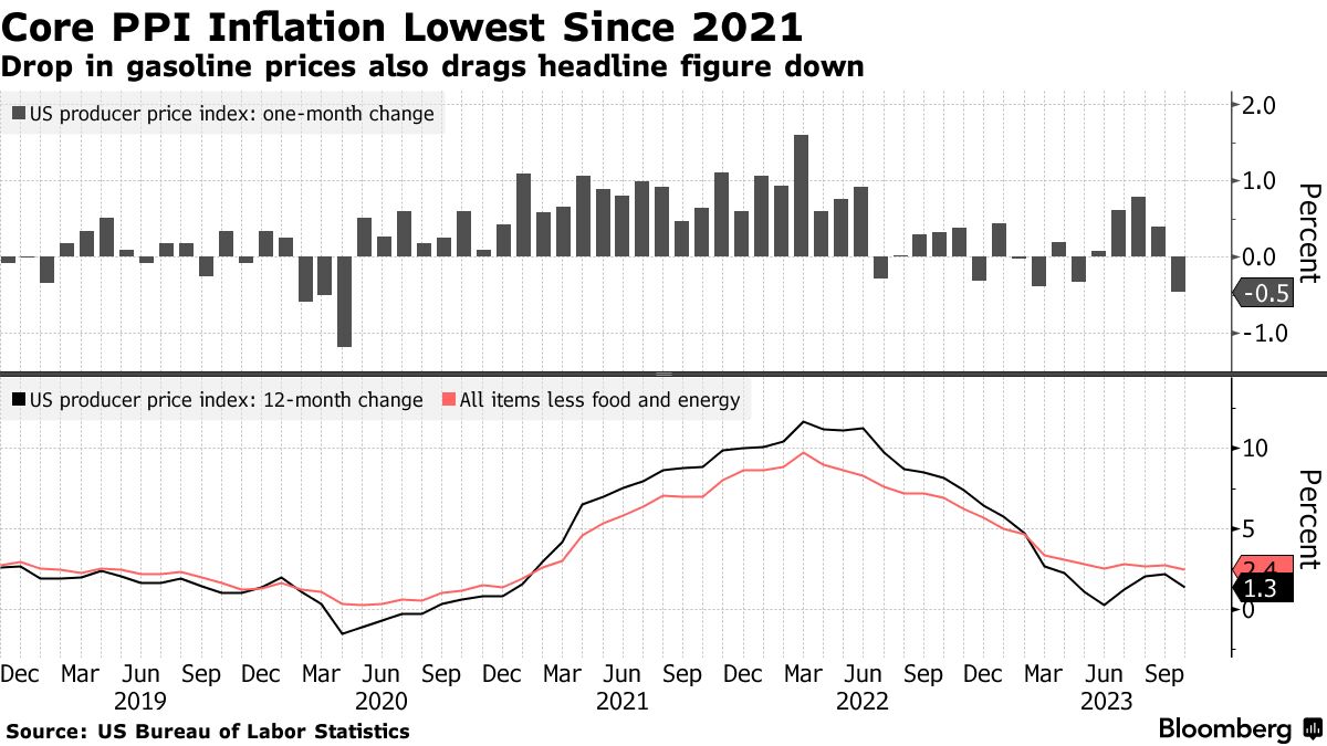 美国生产者支付的价格在十月意外下降,降幅为自2020年4月以来最大,这进一步证明了整个经济中通胀压力正在减弱。