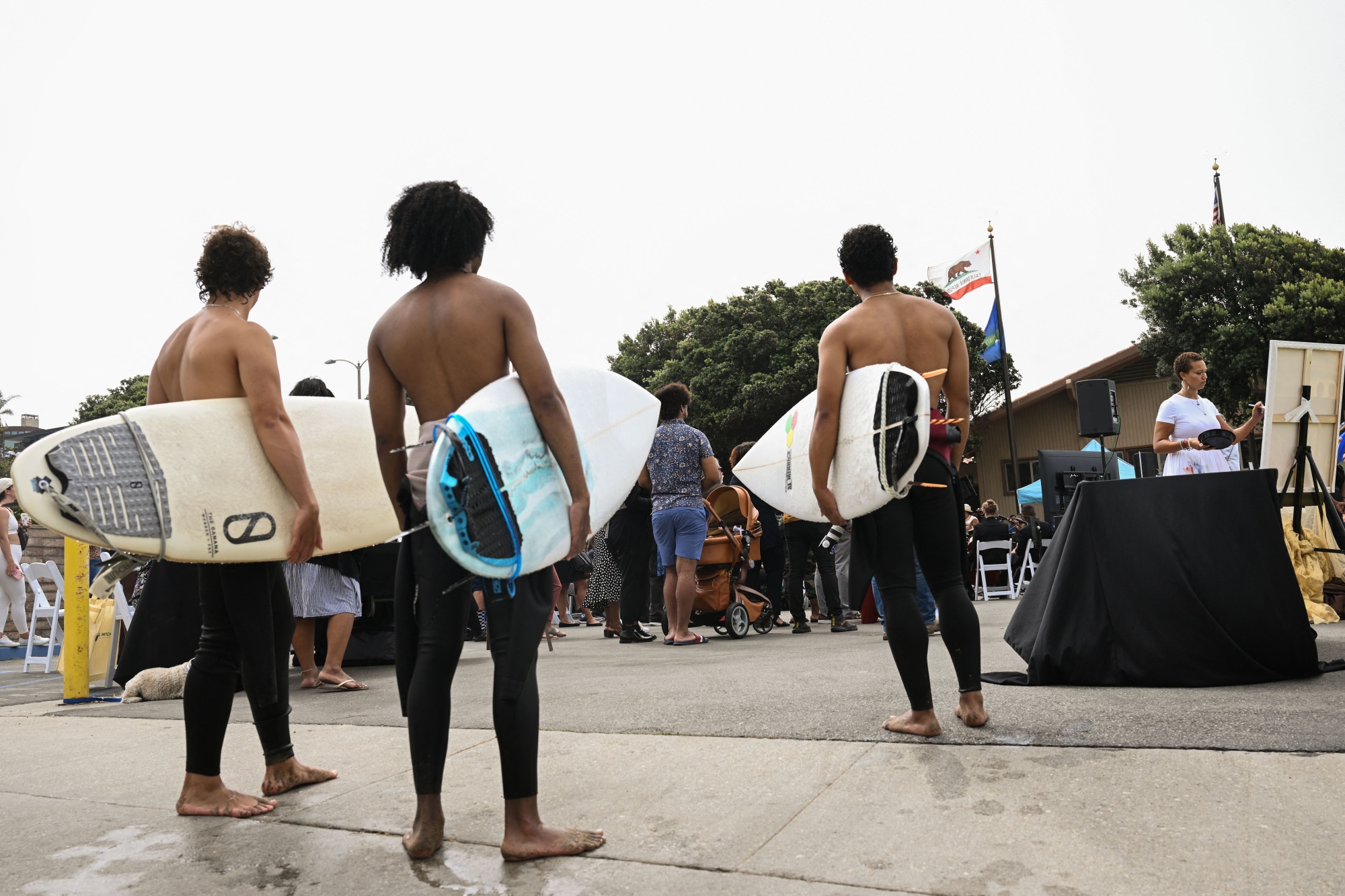 冲浪者们观看在2022年7月20日,加利福尼亚州曼哈顿海滩举行的一场仪式,将布鲁斯海滩的所有权归还给一位黑人家族的后代,这块土地在一个世纪前通过征用被夺走。摄影师:Patrick T. Fallon/AFP via Getty Images你如何看待那些认为像这样的地方性努力根本不是赔偿的模式,甚至可能是一种分散注意力的行为?