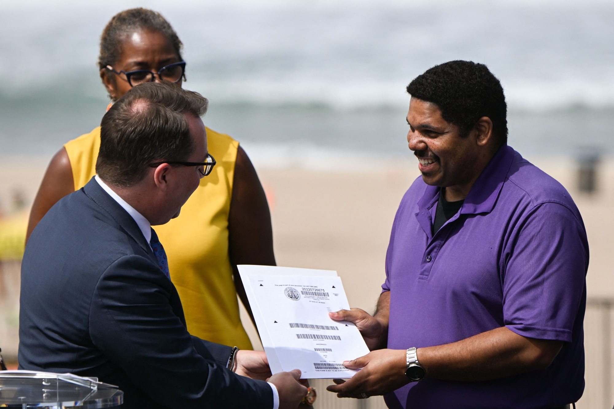 洛杉矶县选民登记员/县书记Dean Logan在2022年7月20日在加利福尼亚曼哈顿海滩举行的布鲁斯海滩所有权归还仪式上将产权证书交还给安东尼·布鲁斯。摄影师:Patrick T. Fallon/AFP via Getty ImagesCityLab与Fatheree就布鲁斯家族的遭遇、关于它是否构成赔偿的争论以及它是否重要进行了交谈。本次对话已经过编辑,以确保长度和清晰度。
