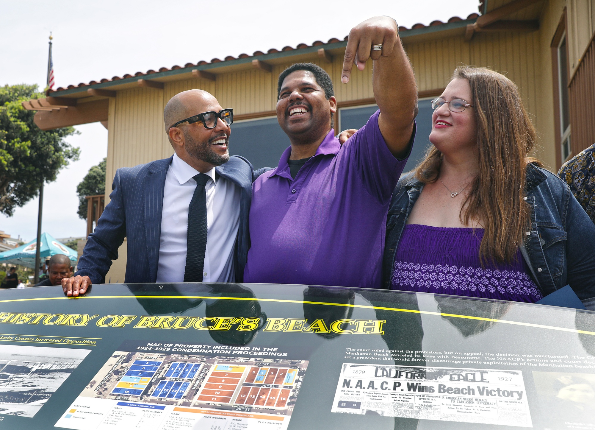 查尔斯和威拉·布鲁斯的曾曾孙安东尼·布鲁斯(Anthony Bruce)中间,左边是代表布鲁斯家族无偿提供法律援助的律师乔治·法瑞(George Fatheree),右边是妻子桑德拉·布鲁斯(Sandra Bruce)。摄影师:克里斯蒂娜·豪斯/洛杉矶时报/盖蒂图片社 您认为每个政府单位都有责任进行一种土地审计,查看哪些土地是不公正地从有色人种手中夺走的?