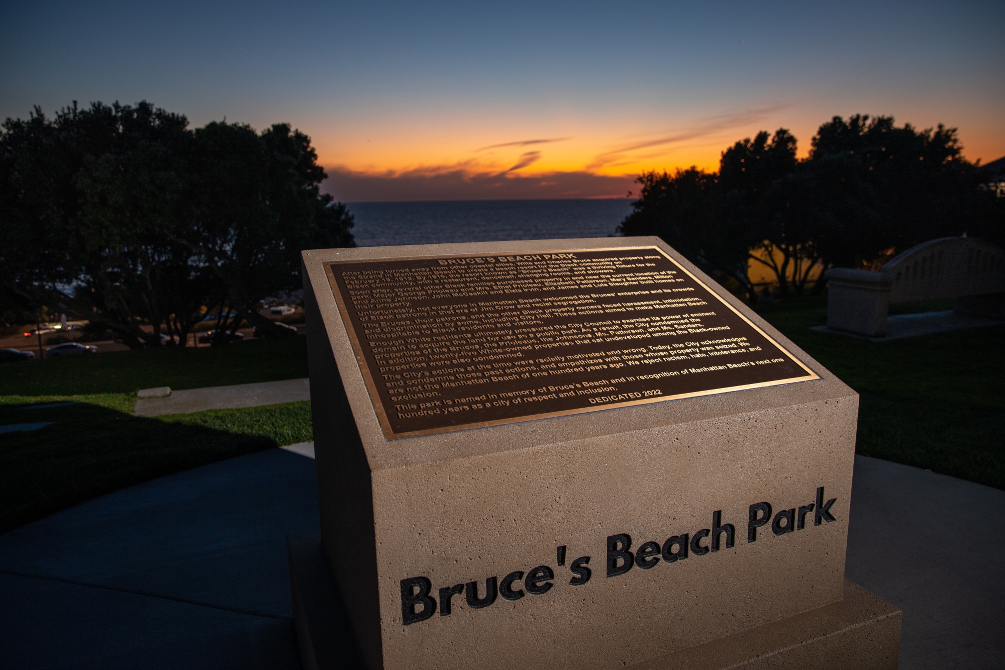 布鲁斯海滩公园的一座纪念碑承认并谴责了加利福尼亚州曼哈顿海滩26街和海兰大道布鲁斯海滩的历史不公正。