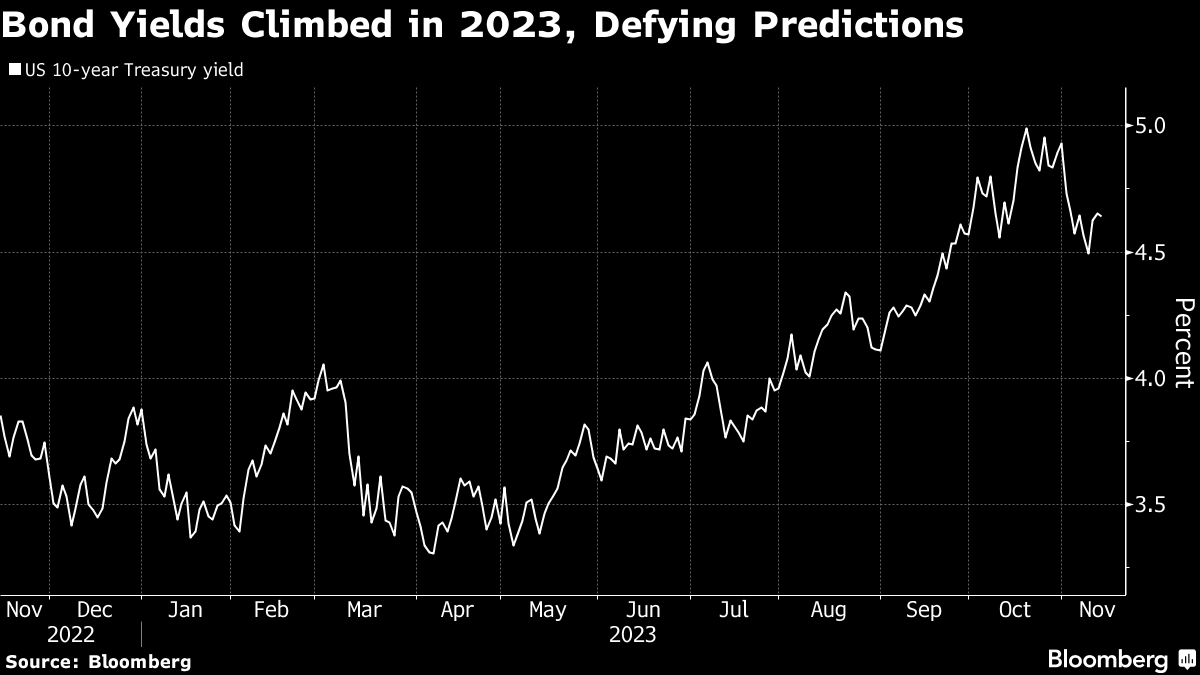 一家投资巨头Pimco,今年原本期待美国国债的复苏,现在已经对2024年充满乐观。今年美国国债的贬值使得10年期国债收益率从4月初的3.3%上升到上个月的5%以上。自那时起,对美联储货币政策收紧已经结束的乐观情绪在本月引发了一轮复苏,国债收益率已经回落至4.45%。