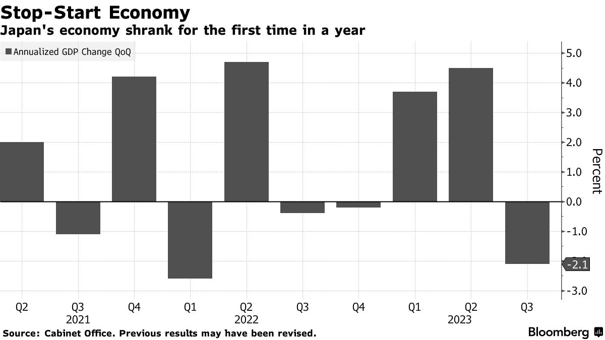 内阁办公室周三报告称,第三季度国内生产总值以年率2.1%的速度收缩,主要是由于企业支出下降、消费支出未能恢复以及进口增加。