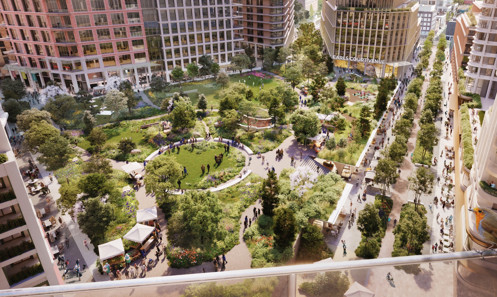 一个CGI图像,显示了厄尔斯科特的The Table Urban Park。来源:伦敦传播机构伦敦最大的清理开发地点之一,厄尔斯科特的重建计划已经被缩减,这是最新的重新思考。