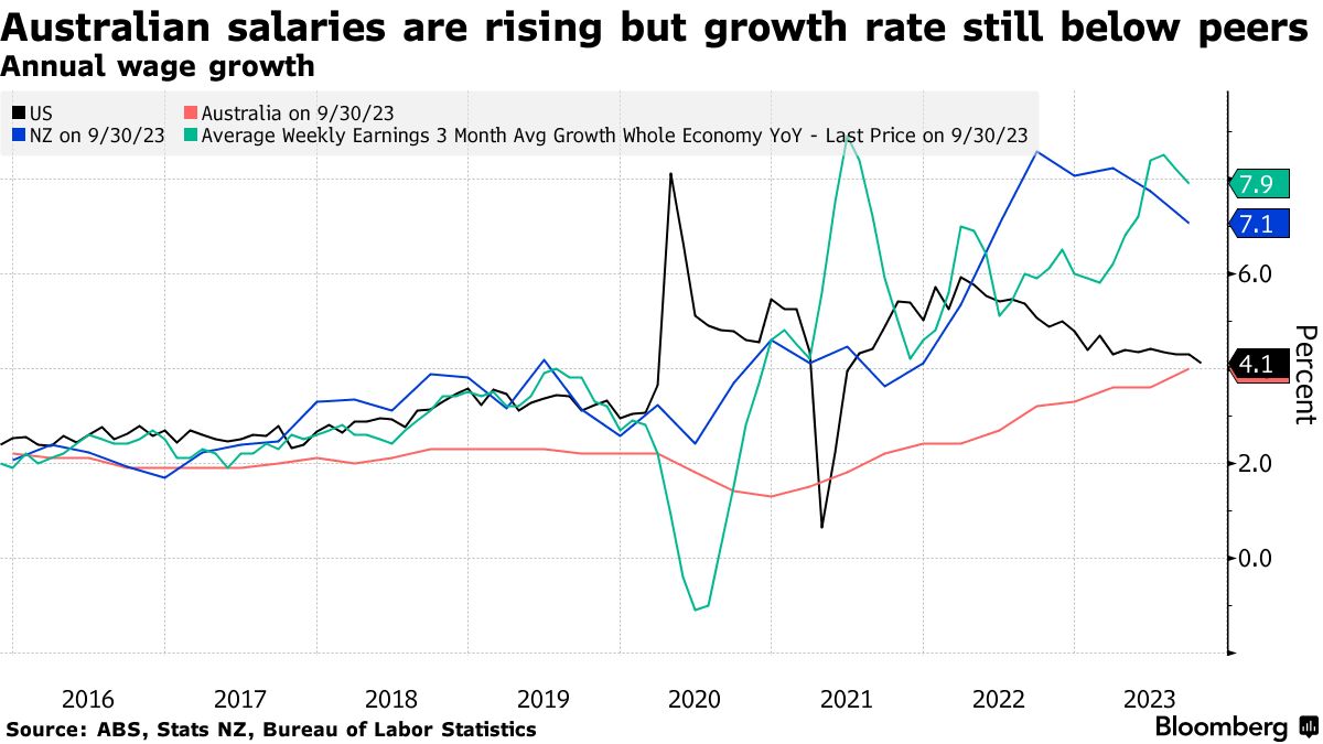 数据表明,与全球同行相比,工资增长仍然相对稳定,并且与目前略低于5.5%的通货膨胀率脱钩。这加强了人们对澳大利亚储备银行将在12月5日年底的最后一次会议上保持4.35%的借贷成本不变的预期,因为它密切关注价格压力。
