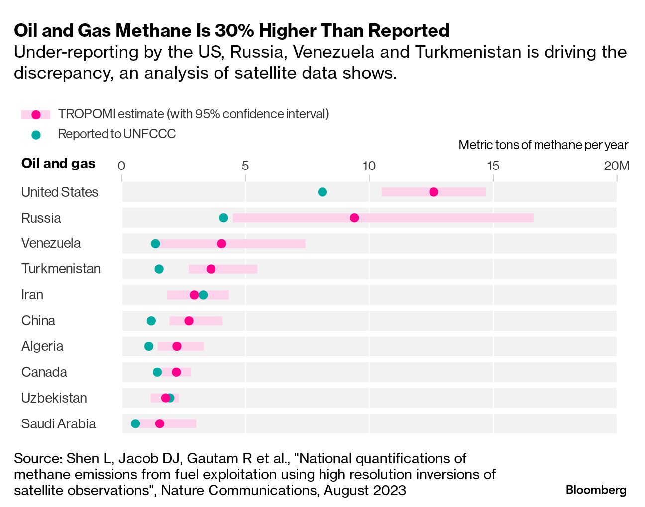 世界上四个最大的石油和天然气排放国 — 美国、俄罗斯、委内瑞拉和土库曼斯坦 — 根据报告占据了大部分整体差距。