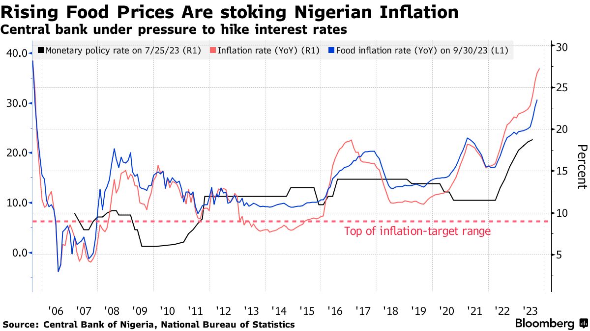 为恢复价格稳定,总部位于阿布贾的尼日利亚中央银行,将于下周召开自七月以来的首次货币政策委员会会议,预计将连续第九次上调利率。自2022年5月以来,已经将利率上调了725个基点至18.75%。