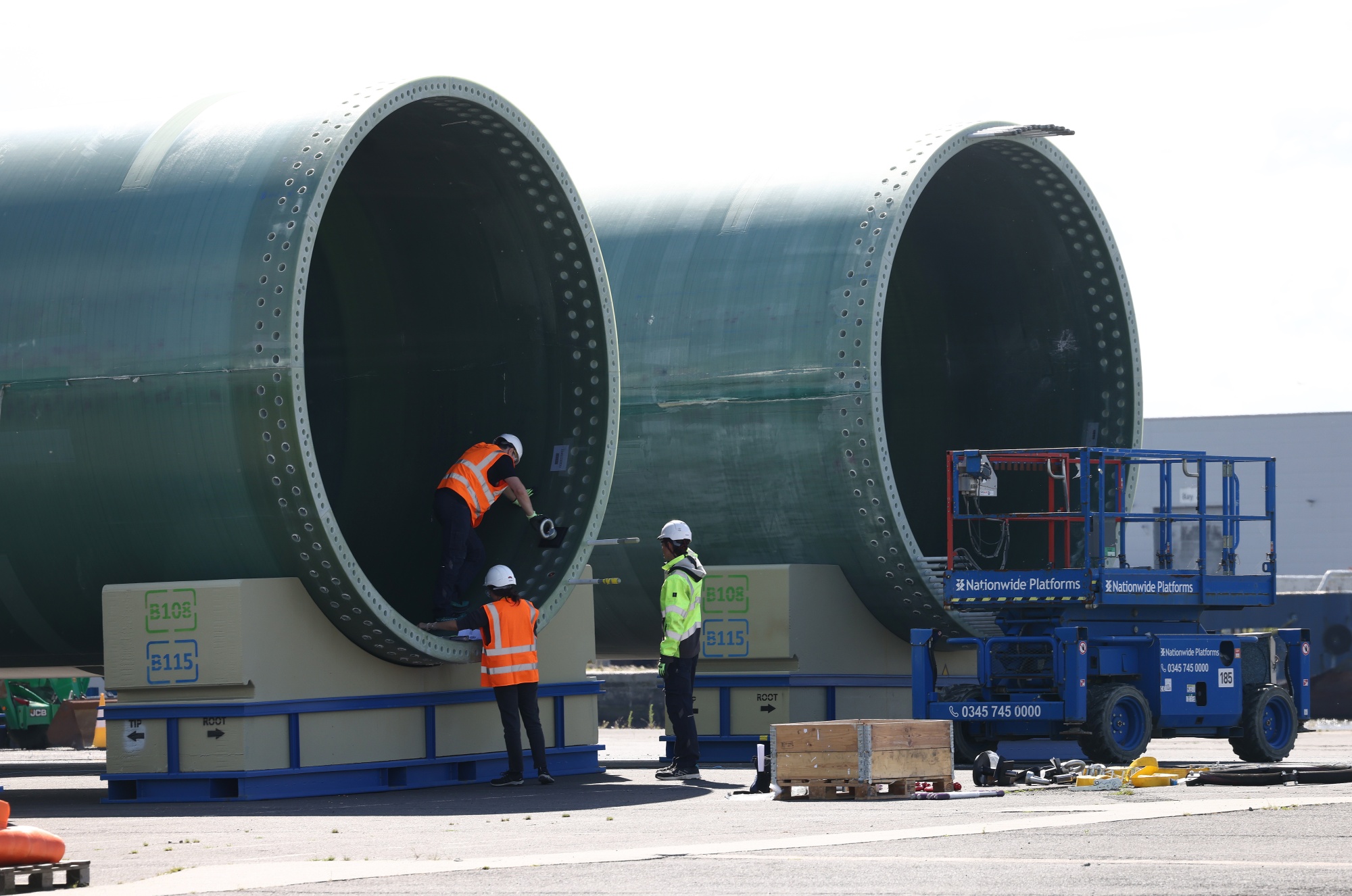 工人们在英国赫尔的西门子Gamesa工厂检查风力涡轮机叶片,时间是2023年8月9日星期三。