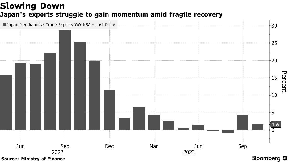 日本的出口在10月增长速度放缓,为该国经济在下半年避免技术性衰退提供了少许支持。