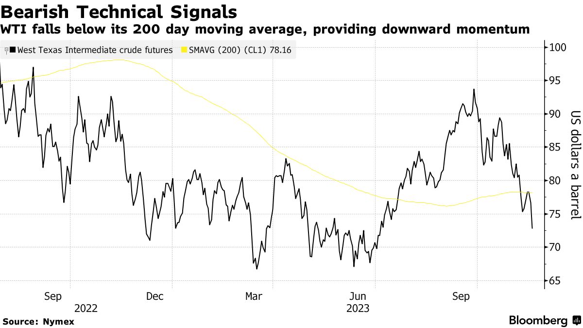 布伦特原油下跌4.6%,收于每桶78美元以下,之后由于算法驱动的交易商在价格跌破每桶80美元时抛售原油持仓。 西德克萨斯中质原油下跌4.9%,收于每桶73美元以下,周三的一份报告显示美国库存上升,该品种突破了其200日移动平均线。
