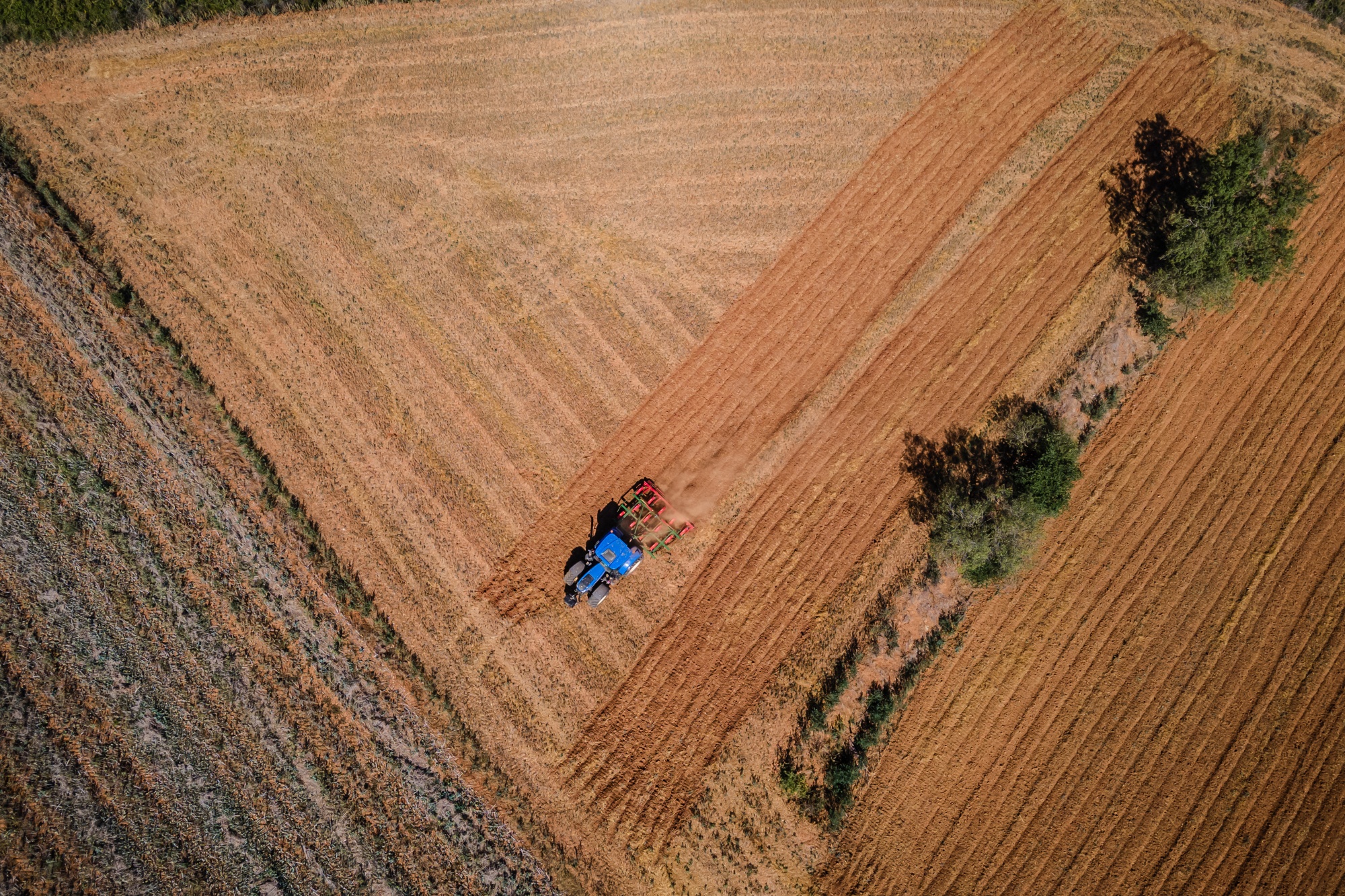一台拖拉机正在西班牙的农田耕作。在田地里撒上碎石可能会增强土地自然吸收空气中的碳的能力。