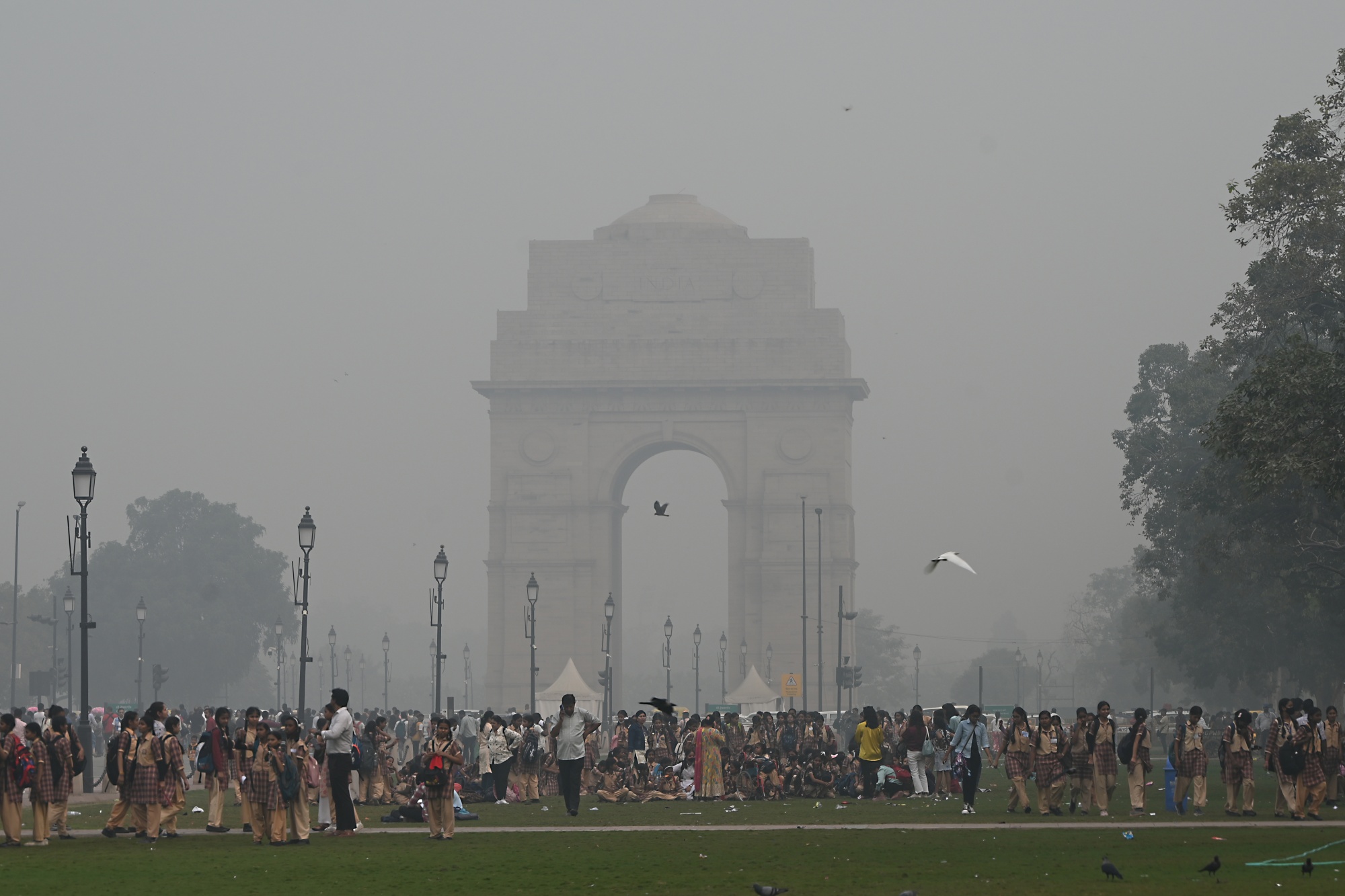 11月4日,新德里印度门前浓雾中的游客。摄影师:Prakash Singh/Bloomberg### 更多来自彭博社的内容