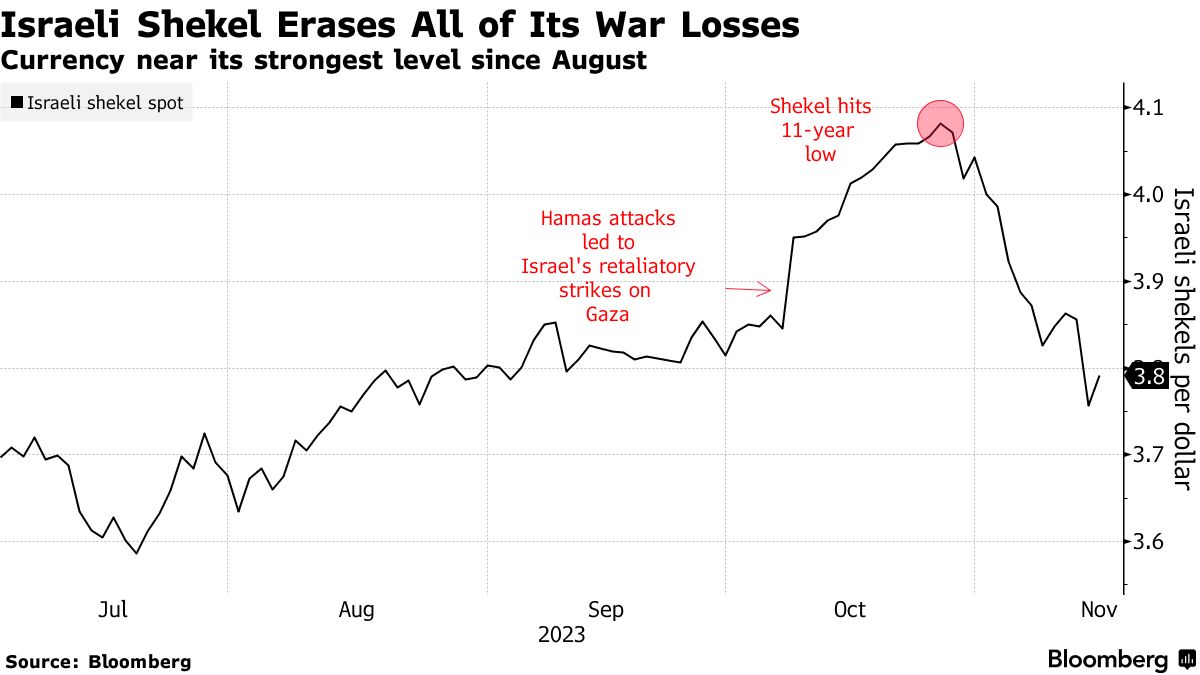 以色列谢克尔已经从全球最糟糕的货币变成了在央行花费数十亿美元保护它免受与哈马斯的战争影响后获得最大涨幅。