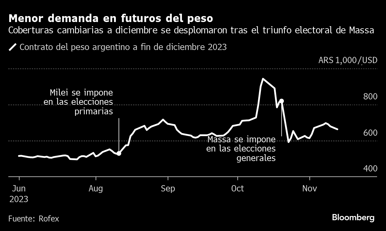 阿根廷比索期货、现金结算和与美元挂钩的债券现在需求较少。12月合约下跌至630比索兑1美元,而在10月22日大选前一周曾触及944比索兑1美元;而在另一市场(所谓的“现金结算”)中,比索兑美元的汇率升至860比索兑1美元,此前曾跌破1,000比索兑1美元。