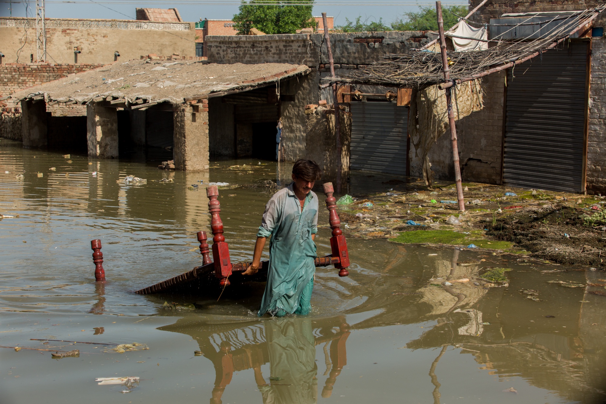 一名男子在巴基斯坦信德省达杜区的戈特穆罕默德尤素夫奈奇(Goth Muhammad Yusuf Naich)拖着一张桌子穿过洪水,时间是2022年9月1日。